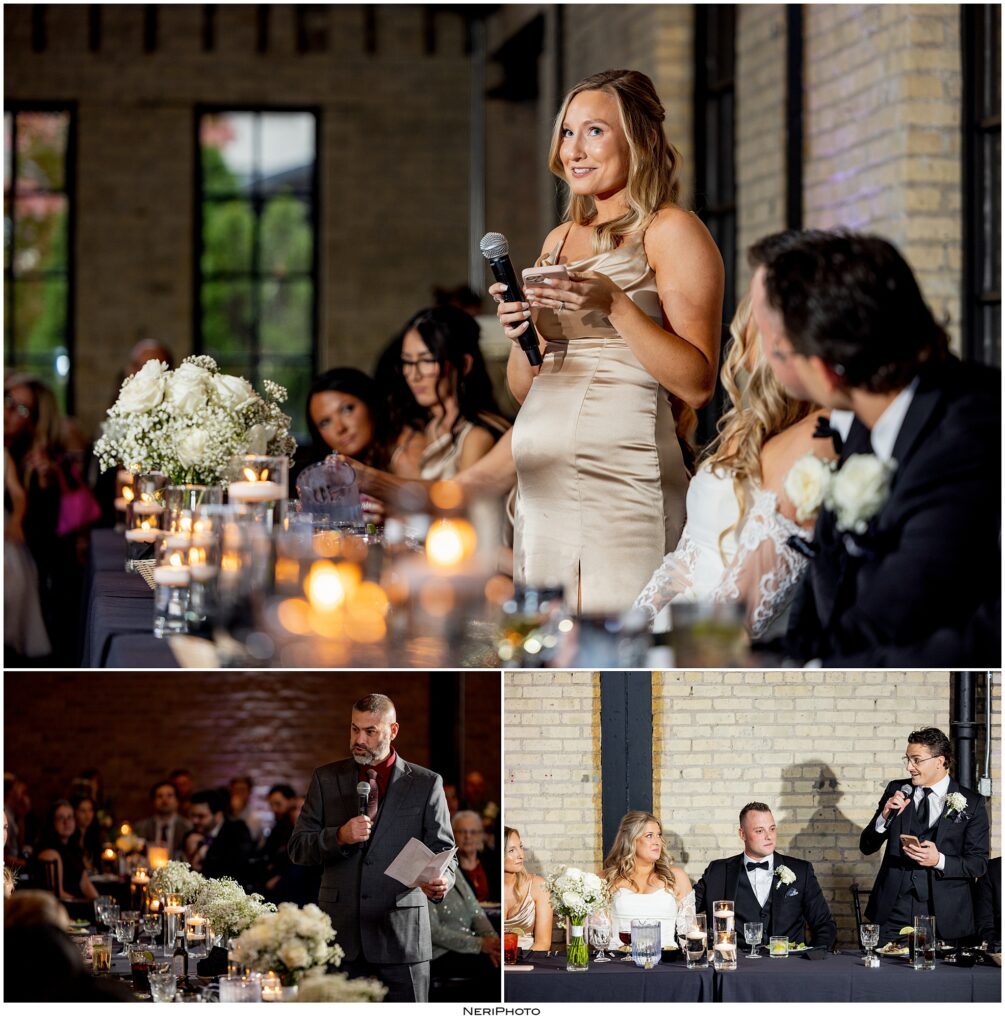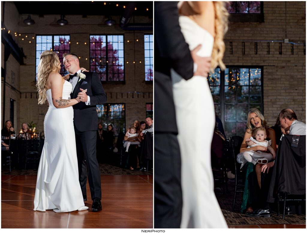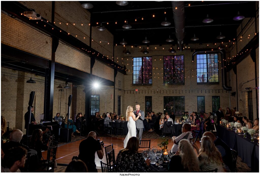 New Vintage Place, managed by Rye Venues, is one of those Grand Rapids spaces that balances industrial charm with timeless elegance. Exposed brick, towering windows, and warm wooden beams set the tone for a day that was both effortlessly stylish and deeply personal. The couple chose to hold both their ceremony and reception at the venue, transforming it from romantic vows to an unforgettable party under the same glowing lights.