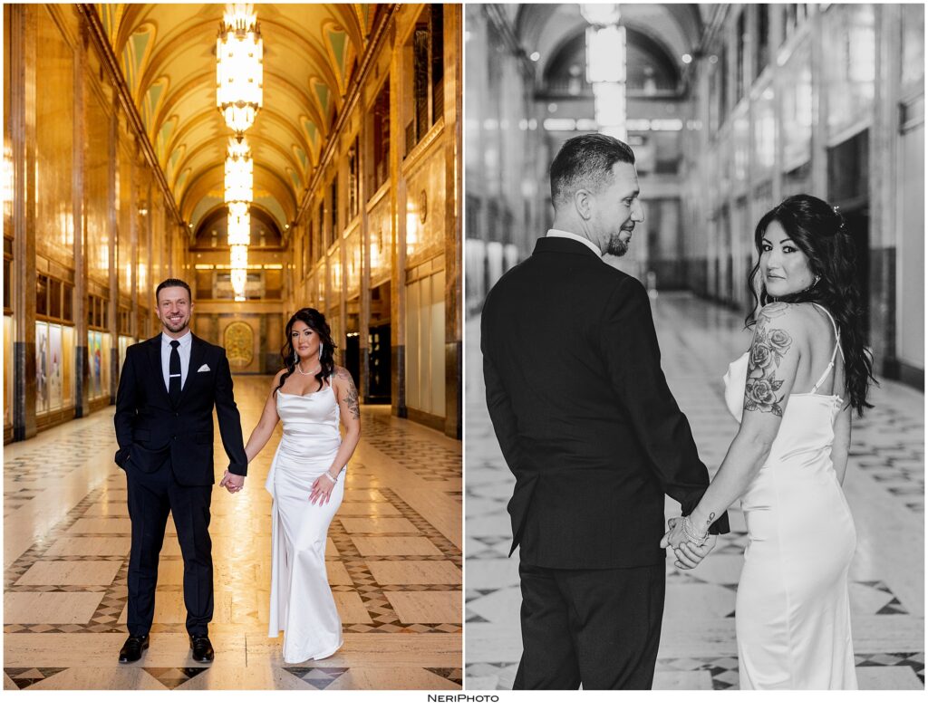 The variety you can get by doing Fisher Building engagement photos is one of the best things. You don’t have to step outside for this variety. The building feels grand, but it also has quieter corners that let the connection between two people take center stage. That balance made this session feel both romantic and personal.